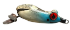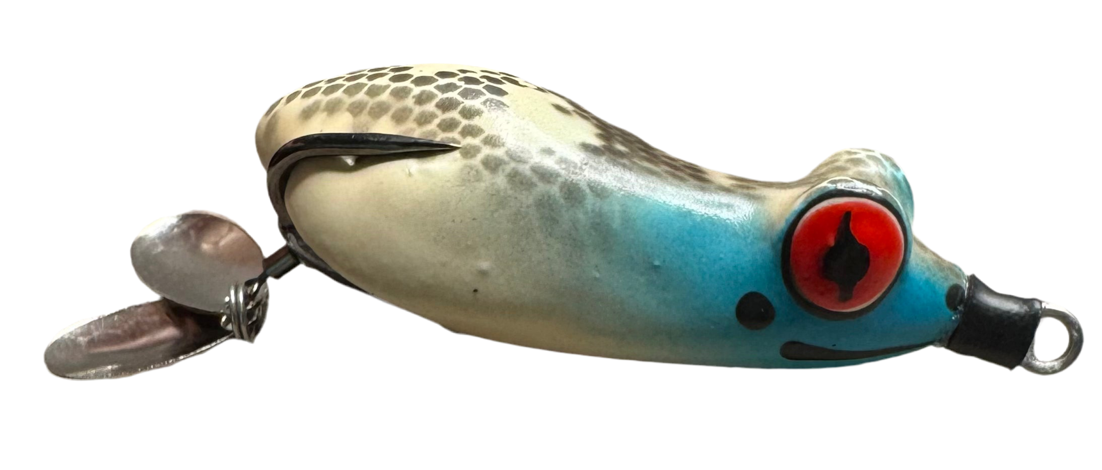 Hollow body, double bladed topwater frog Externally weighted for a large hook gap.  Heavy duty hooks hug the body contours for a weedless design.