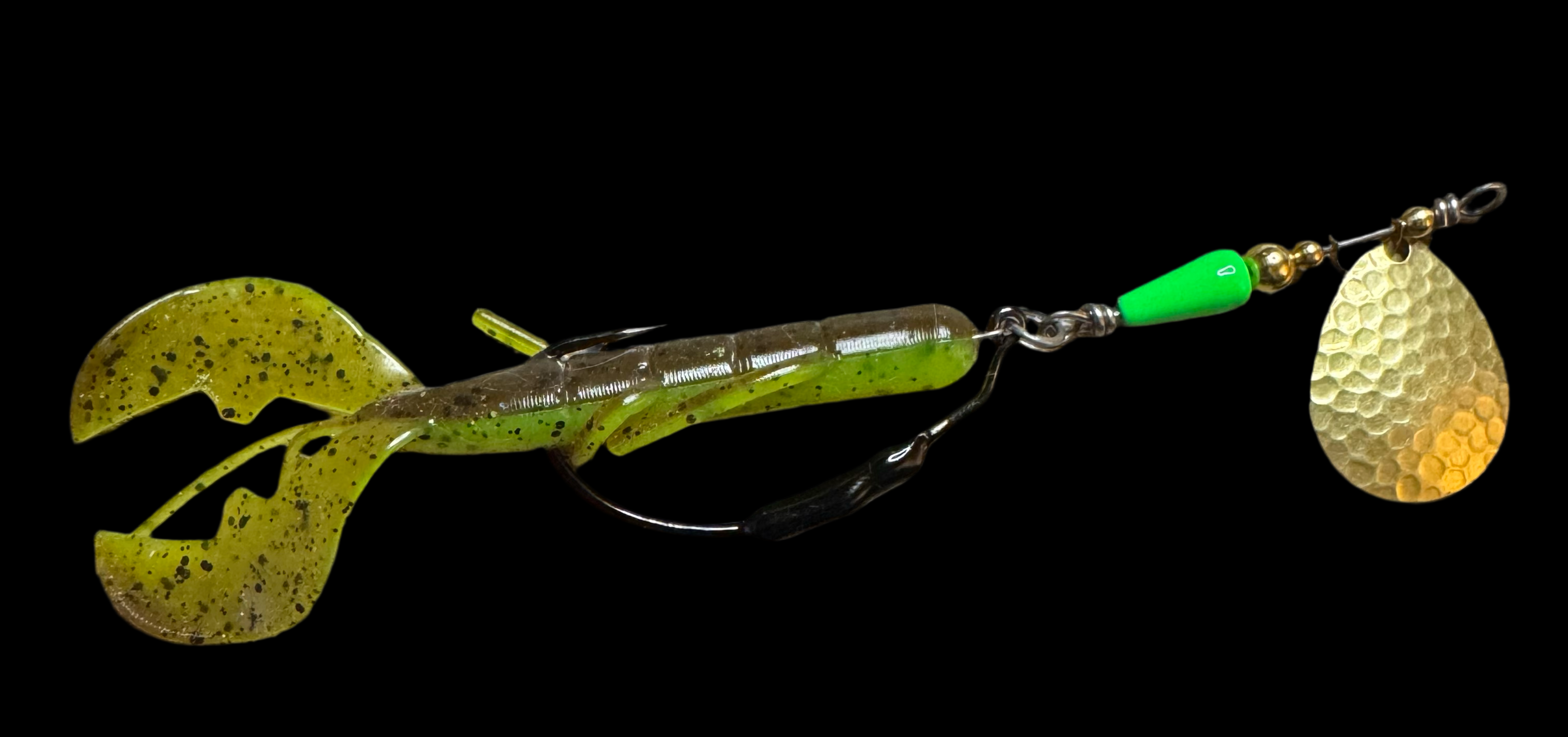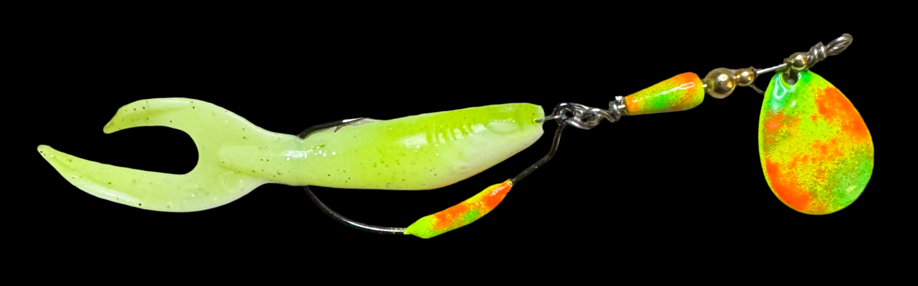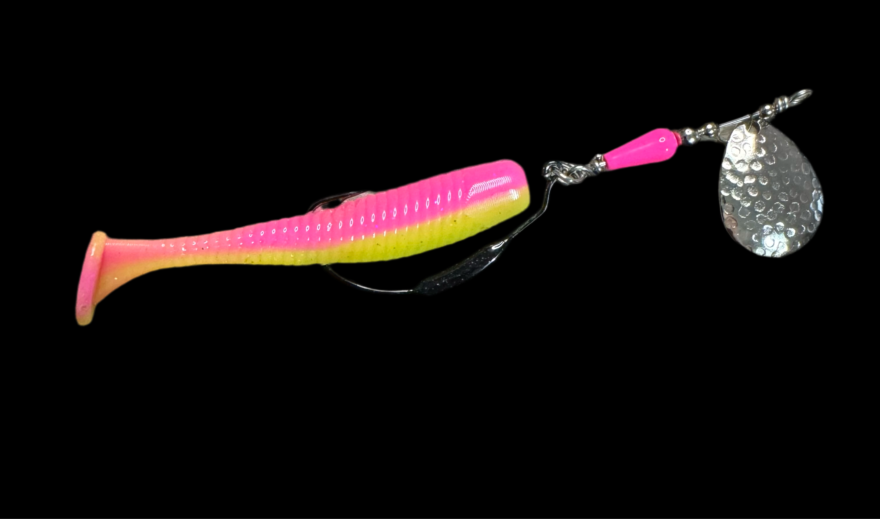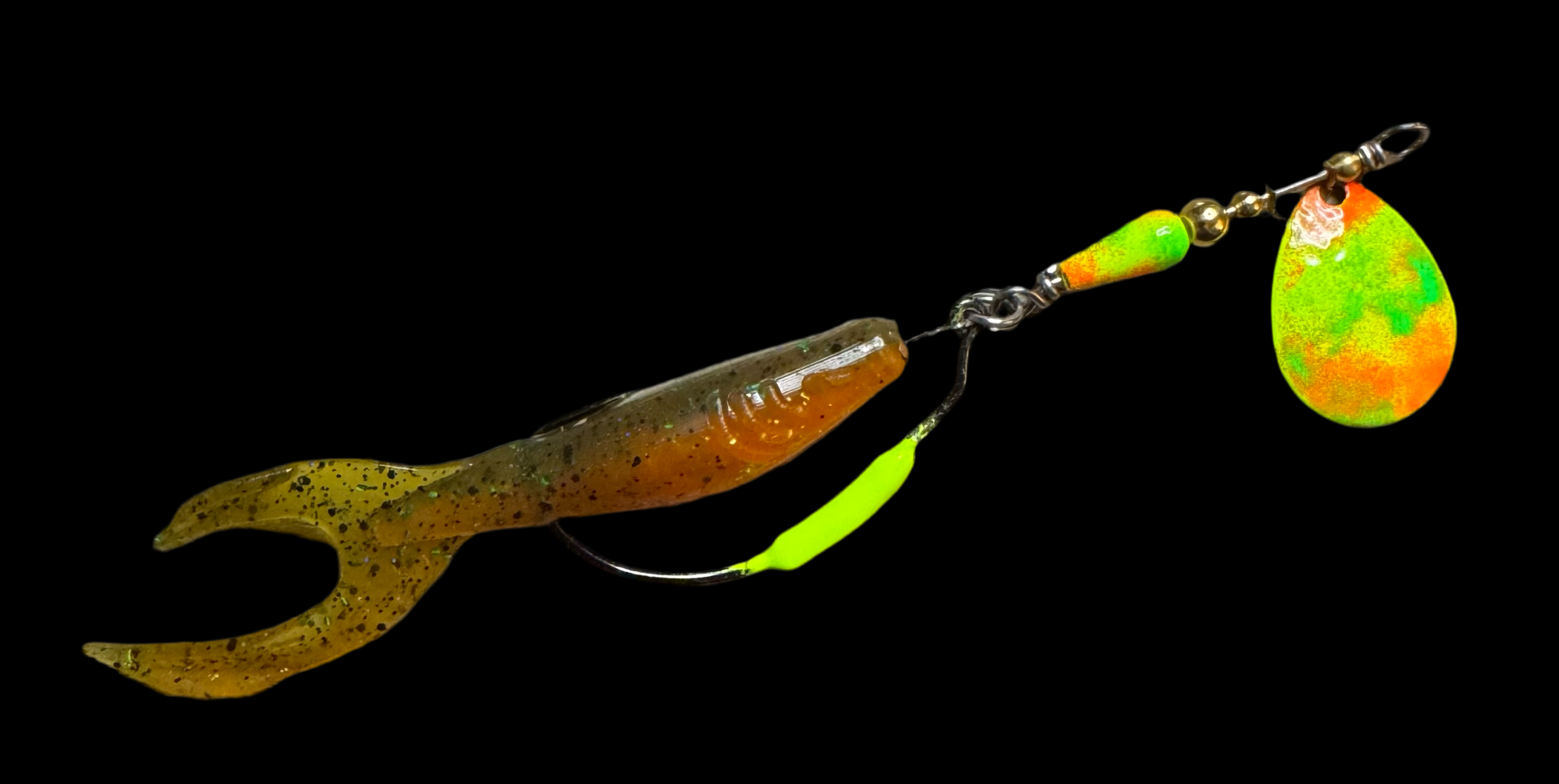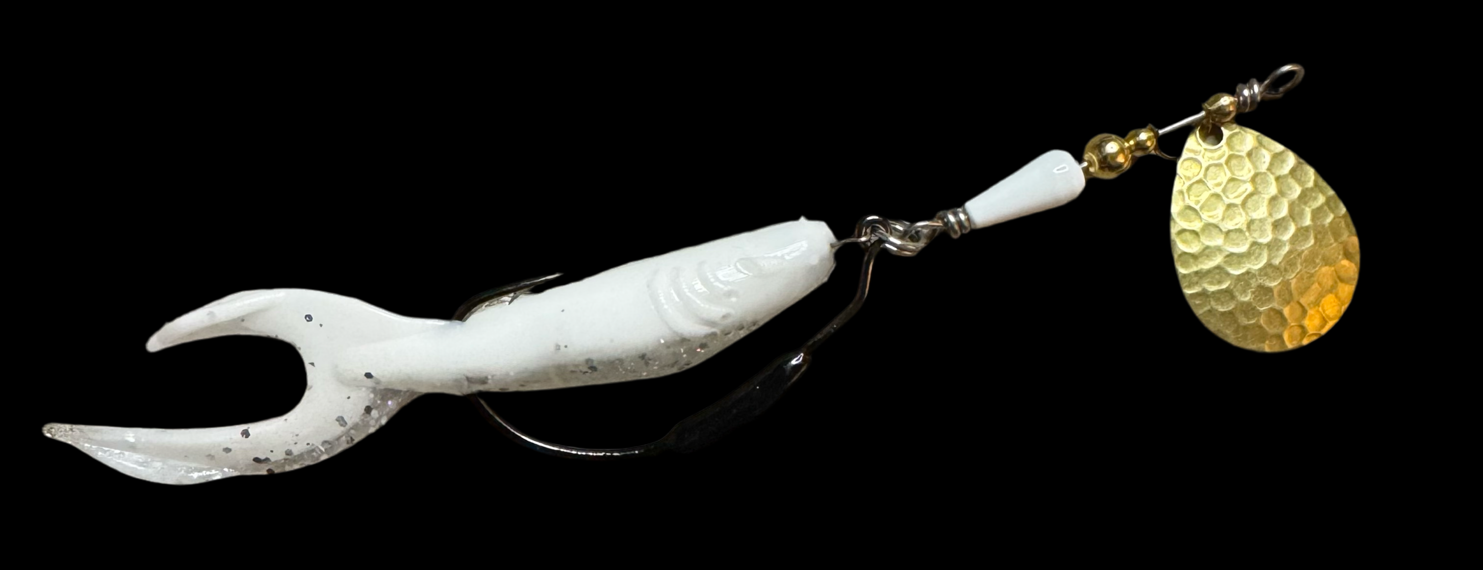 Weedless inline spinner bait. Available with a 1/8 oz underspin hook OR a weighted VMC heavy duty Swimbait hook. All Scorpions come rigged with a soft trailer bait. Our bladed hook spinner can be fished like a traditional spinner bait or jigged thanks to the underspin blade. For custom configurations, leave details in the comment box at checkout.