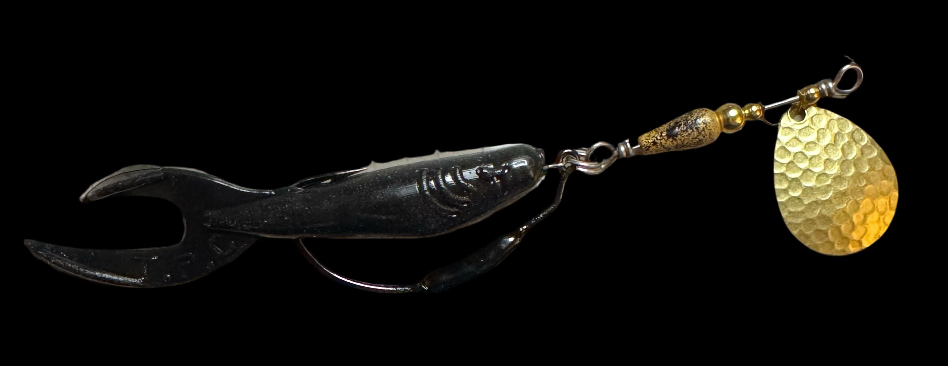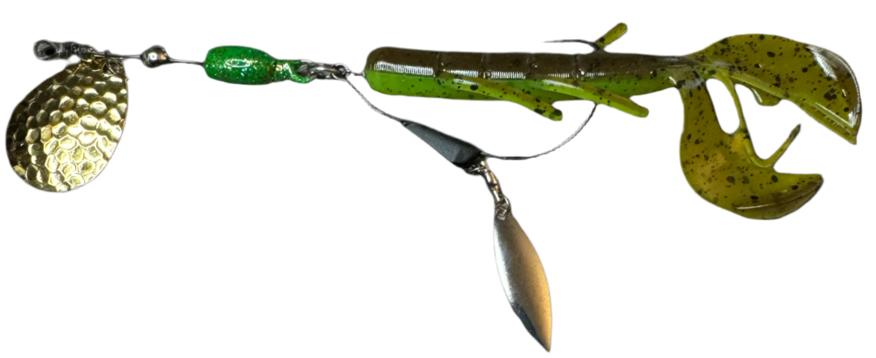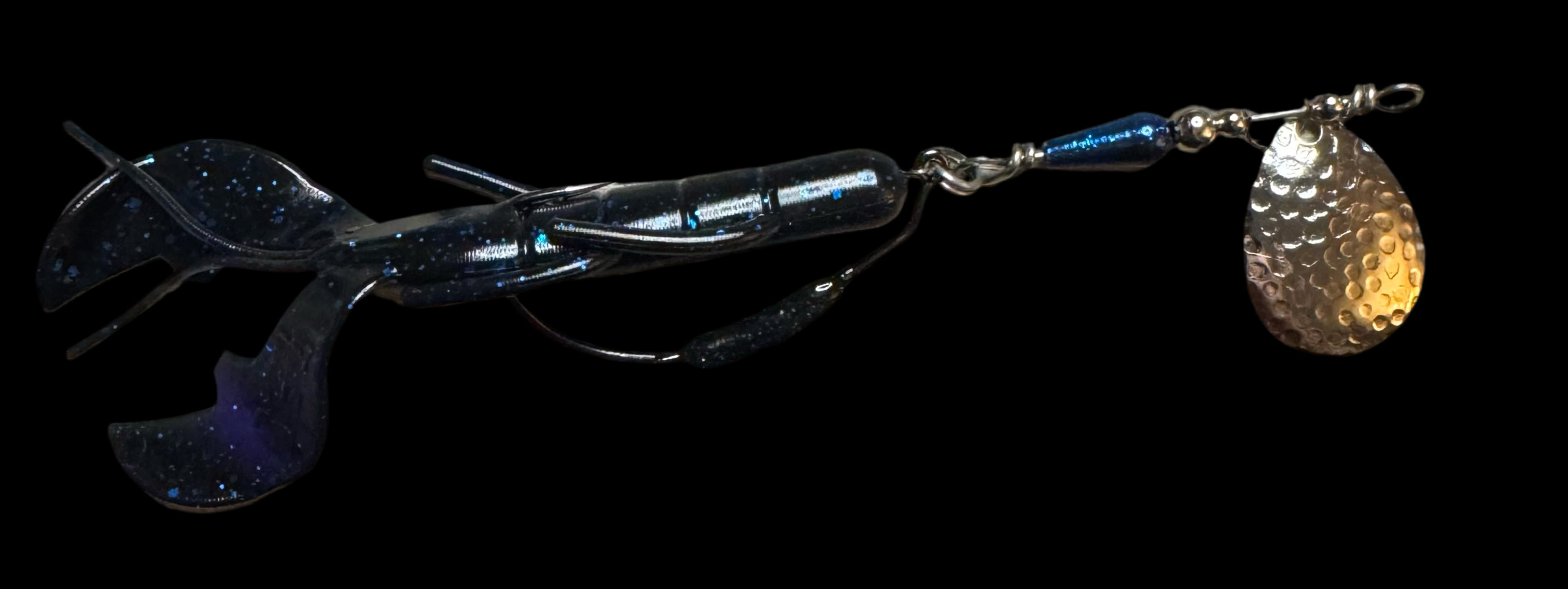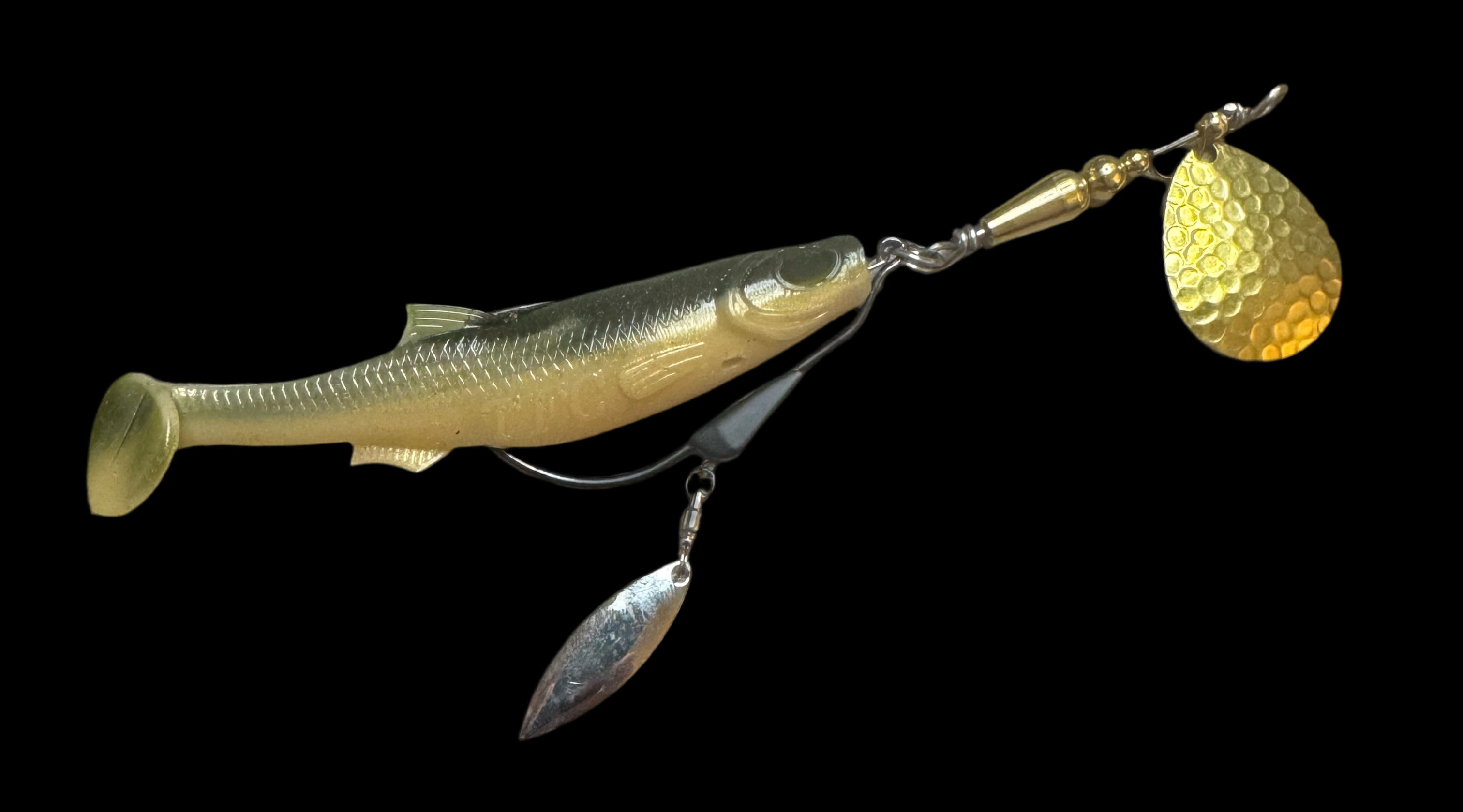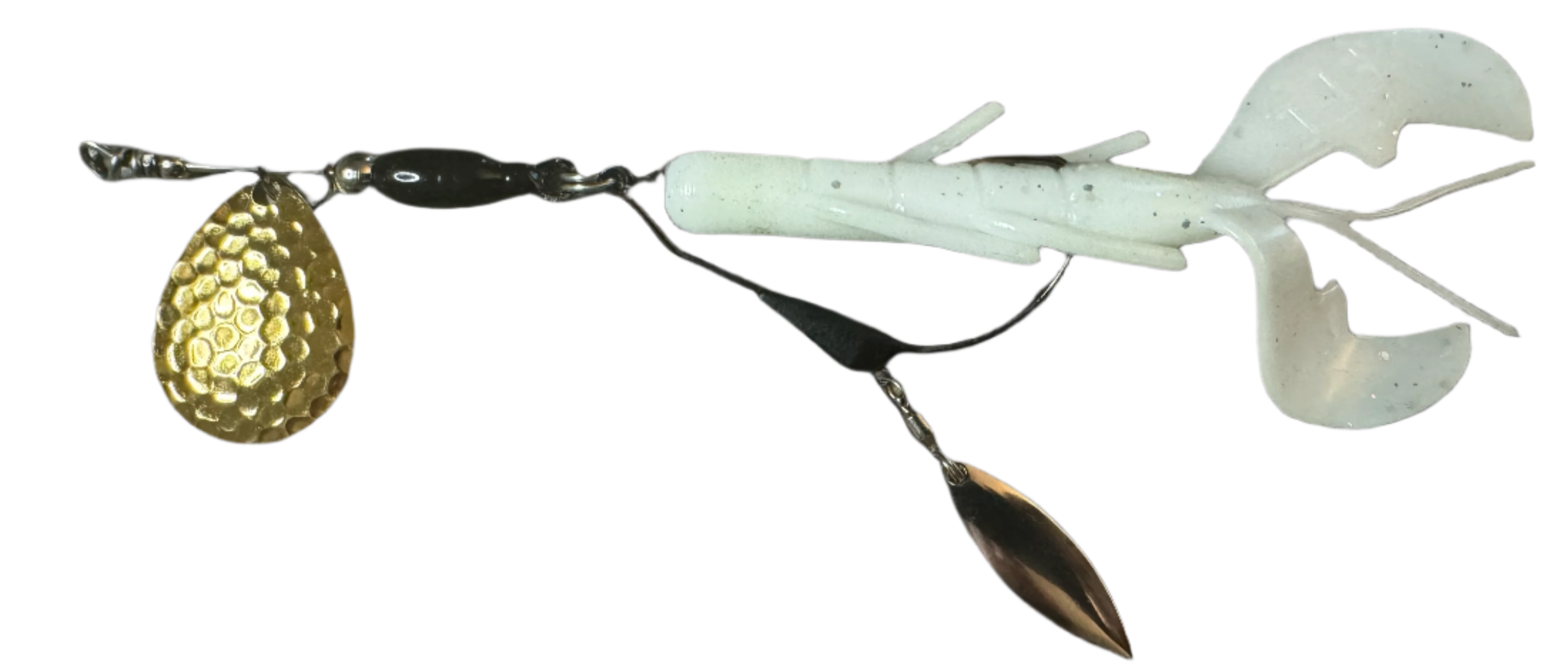 Weedless inline spinner bait. Available with a 1/8 oz underspin hook OR a weighted VMC heavy duty Swimbait hook. All Scorpions come rigged with a soft trailer bait. Our bladed hook spinner can be fished like a traditional spinner bait or jigged thanks to the underspin blade. For custom configurations, leave details in the comment box at checkout.